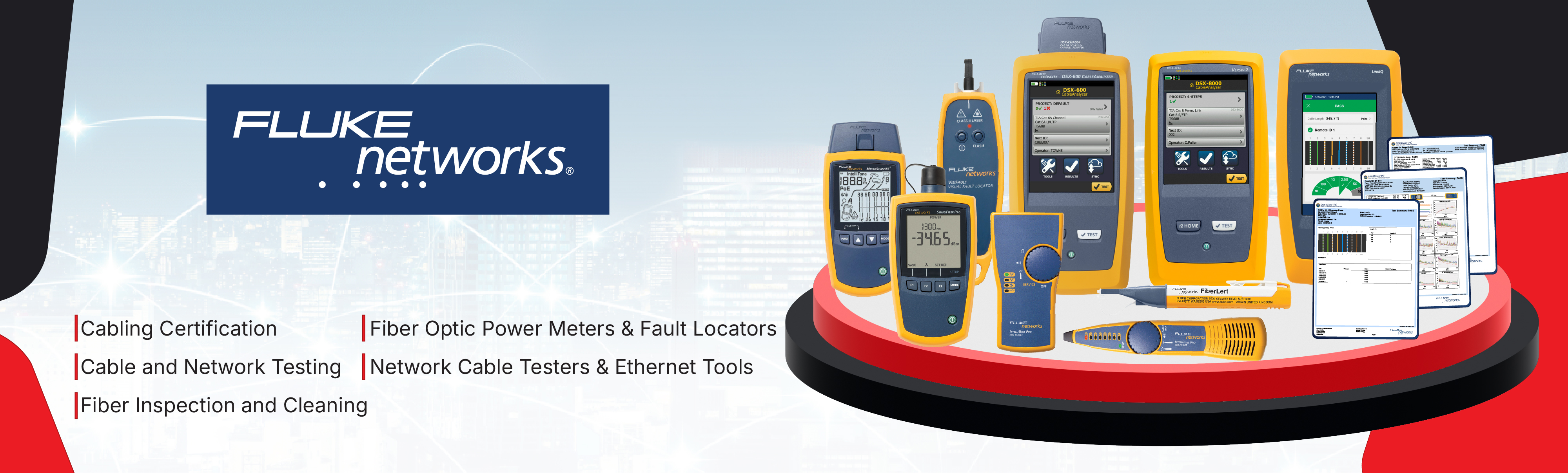 Fluke Networks ผู้นำระดับโลกด้านการตรวจสอบคุณภาพสายเคเบิล การแก้ไขปัญหาเครือข่าย ยกระดับมาตรฐานงานติดตั้งสายเคเบิลและการวางระบบเครือข่าย Fluke Networks นำเสนอเครื่องมือทดสอบสายเคเบิลที่หลากหลาย ครอบคลุมทั้งสายเคเบิลทองแดงและไฟเบอร์ออปติก รองรับงานระดับ Data center ที่ซับซ้อน ไปจนถึงการติดตั้ง ตรวจสภาพ และแก้ไขปัญหาเครือข่ายในพื้นที่โรงงานหรืออาคารพาณิชย์
