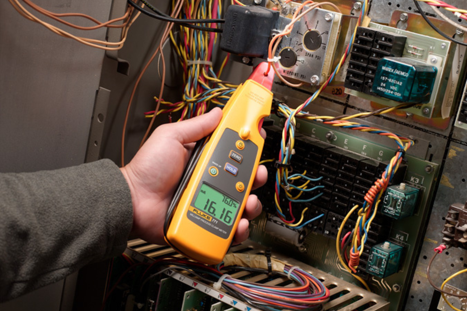 [Image of Fluke 771 Milliamp Process Clamp Meter measuring a 4-20mA loop wire in a control panel]