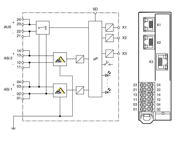 VBG-EP1-KE5-DMD เป็นเกตเวย์ PROFINET / EtherNet/IP สำหรับเครือข่าย AS-Interface 2 เครือข่ายตามข้อกำหนด AS-Interface 3.0 เกตเวย์นี้ใช้สำหรับเชื่อมต่อระบบ AS-Interface เข้ากับตัวควบคุม PROFINET ที่อยู่ระดับสูงกว่า