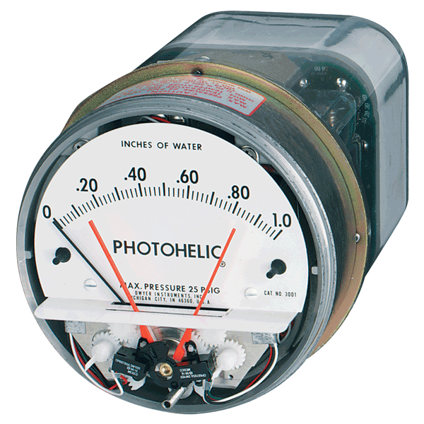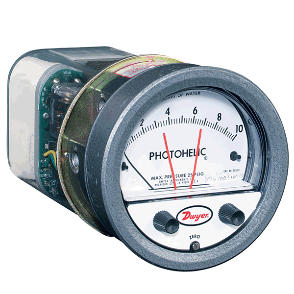 The Series A3000 Photohelic® Switch/Gages function as versatile, highly repeatable pressure switches combined with a precise pressure gage employing the time-proven Magnehelic® gage design. The Photohelic® switch/gage measures and controls positive, negative or differential pressures of air and compatible gases. Standard models are rated to 25 psig (1.7 bar) with options to 35 (2.4) or 80 (5.5 bar) psig. Two phototransistor actuated, DPDT relays are included for low/high limit control. Easy to adjust set point indicators are controlled by knobs located on the gage face. Individual set point deadband is one pointer width - less than 1% of full scale. Set points can be interlocked to provide variable deadband - ideal for control of fans, dampers, etc. Gage reading is continuous and unaffected by switch operation, even during loss of electrical power. Choose from full scale pressure ranges from a low 0-.25 in (0-6 mm) w.c. up to 30 psi (21 bar).