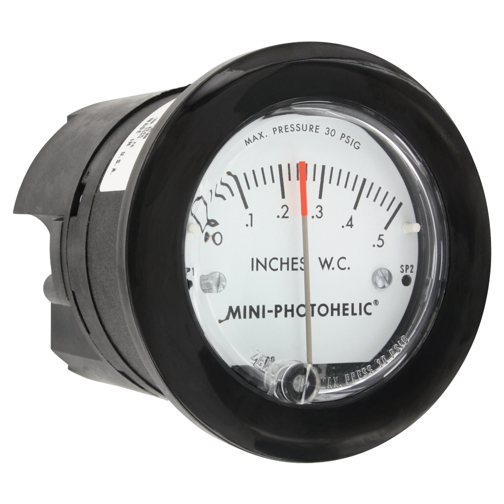 The Series MP Mini-Photohelic® Differential Pressure Switch/Gage combines the time proven Minihelic® II differential pressure gage with two SPDT switching set points. The Mini-Photohelic® switch/gage is designed to measure and control positive, negative, or differential pressures consisting of non-combustible and non-corrosive gases. Gage reading is independent of switch operation. Switching status is visible by LED indicators located on the front and rear of the gage. Set points are adjusted with push buttons on the back of the unit.
