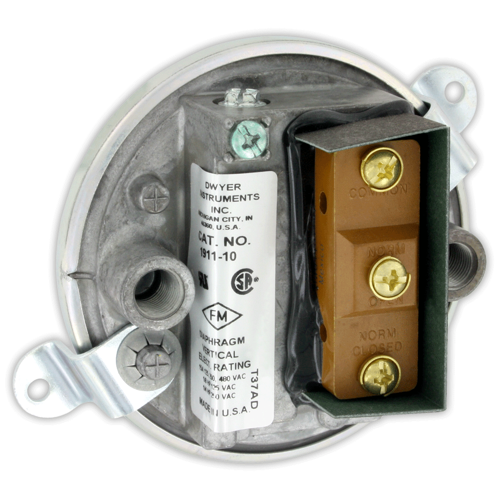 Our most popular Series 1900 Compact Low Differential Pressure Switch combines advanced design and precision construction to make these switches able to perform many of the tasks of larger, costlier units. Designed for air conditioning service, they also serve many fluidics, refrigeration, oven and dryer applications. For air and non-combustible compatible gases, Series 1900 switches have set points from 0.07 to 20" w.c. (1.8 to 508 mm). Set point adjustment is easy with range screw located inside conduit enclosure. Internal location helps prevent tampering. UL, CE and CSA listed, and FM approved.