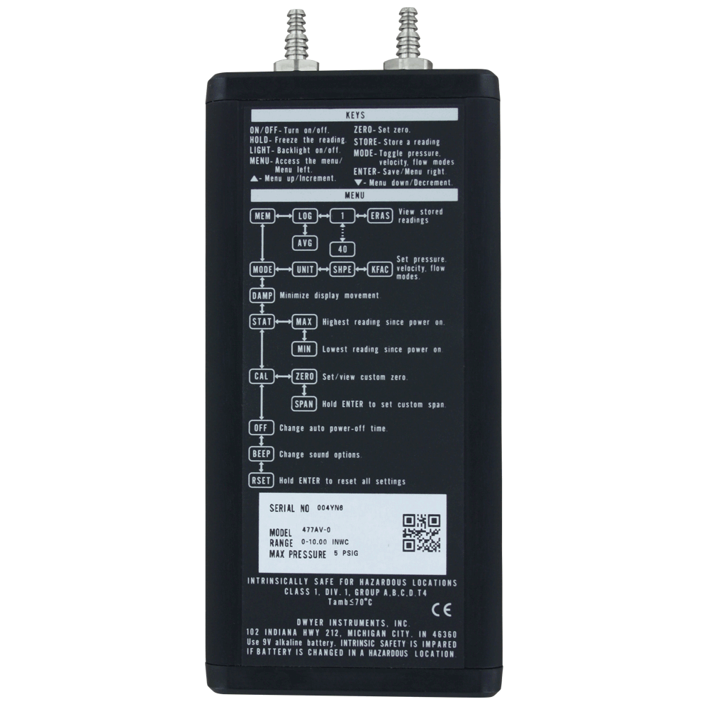 The Series 477AV Handheld Digital Manometer is now available with pressure, flow, and velocity measurements along with a number of other convenient features. The built-in air velocity and flow calculations provide accuracy and conserve time and error associated with manual calculations. Also featured on this unit are adjustable zero and span values for calibrating in the field, as well as a damping feature to compensate for the fluctuating of readings.