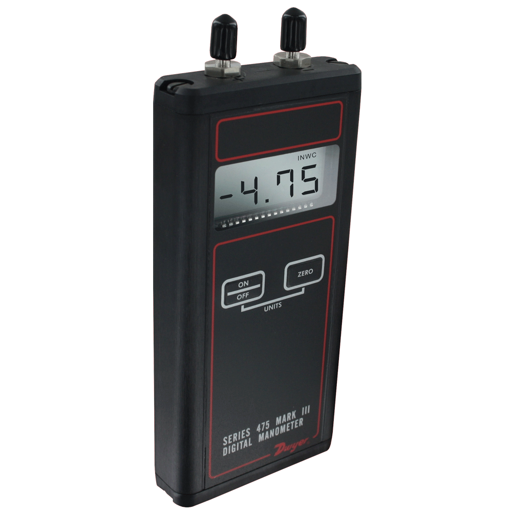 The Series 475 Handheld Digital Manometer measures positive, negative, or differential pressures of air and natural gases in ranges from 1 in w.c. (0.249 kPa) to 150 psid (10.34 bar). The dual push pads on the front panel control the on/off, auto zero, and pressure unit selection, allowing for simple operation with no set up needed. When used with a Dwyer® Pitot tube, the Series 475 can also be used as an air velocity gage.