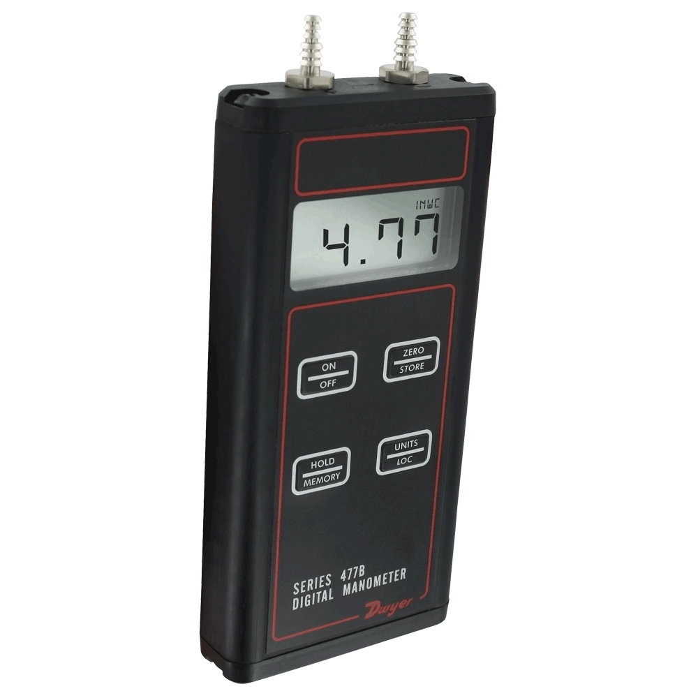 The Series 477B Handheld Digital Manometers are versatile, hand-held, battery operated manometers available in several basic ranges from 0-20 in w.c. up to 100 psi. All models measure either positive, negative or differential pressures with ±0.10% of full scale accuracy. You can select from up to seven common English and metric pressure units so conversions are not necessary. A memory function allows storage of up to 40 readings for later recall and a backlight provides auxiliary lighting for hard-to-see locations. Also standard is a hold feature; plus both visual and audible overpressure alarms.