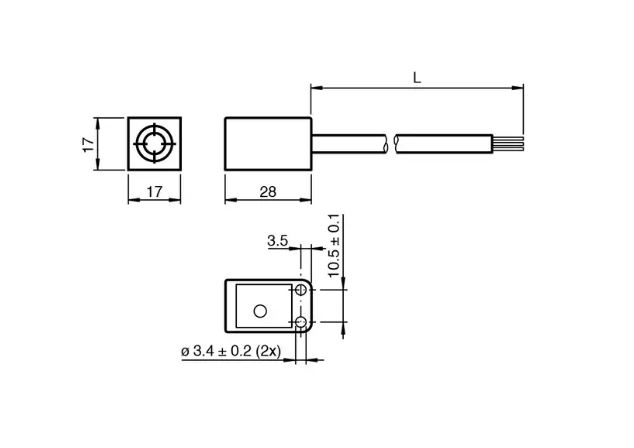 Proximity sensor หัวโผล่(Non-Flush),ระยะการตรวจจับ 5 มิลลิเมตร ใช้ไฟ10 - 30VDC 3 สาย Output NPN/NO ขนาด 17 x 17 x 28 mm. สายยาว 2 เมตร