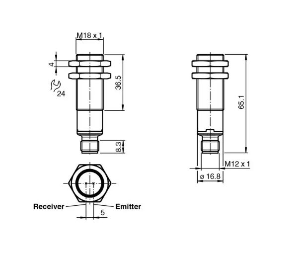 Retroreflective sensor (แบบใช้คู่กับแผ่นสะท้อน),ระยะการตรวจจับ 5.5 เมตร ใช้ไฟ10 - 30VDC 4 สาย Output PNP LO/DO Connector M12