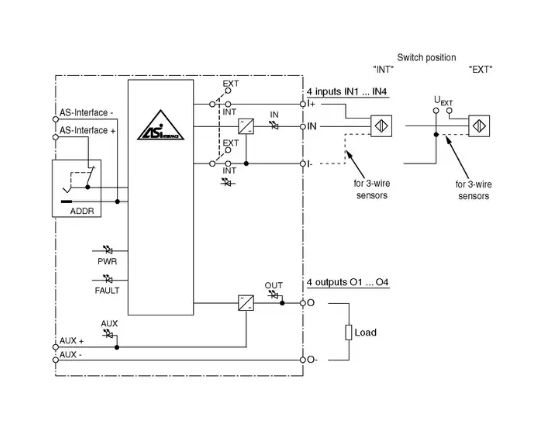 AS-Interface Slave 4 Input/4 Output AS-I version 3.0 Node type A/B node Ambient temperature -25 ... 60 °C , 4 inputs for 2- or 3-wire sensors (PNP) , DC IP20 มีไฟแสดงสถานะ Power , Fault , Input/Ouput