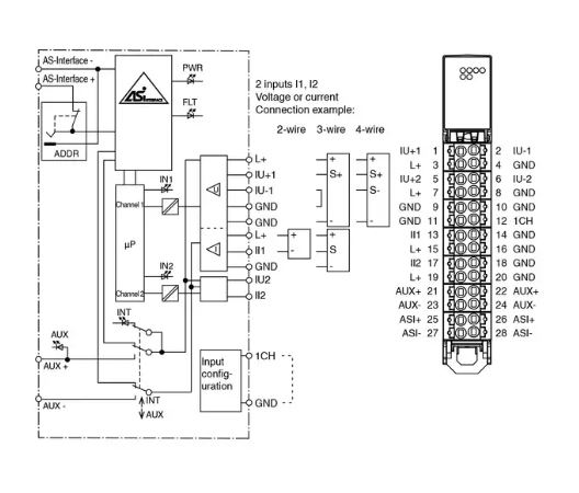 AS-Interface Slave 2 Input analogue Current: 0 ... 20 mA/4 ... 20 mA, voltage: 0 ... 10 V Resolution 15 Bit, AS-I version 3.0 Ambient temperature -25 ... 70 °C , IP20 มีไฟแสดงสถานะ Fault , Power , Input การต่อสายแบบ push-in terminals