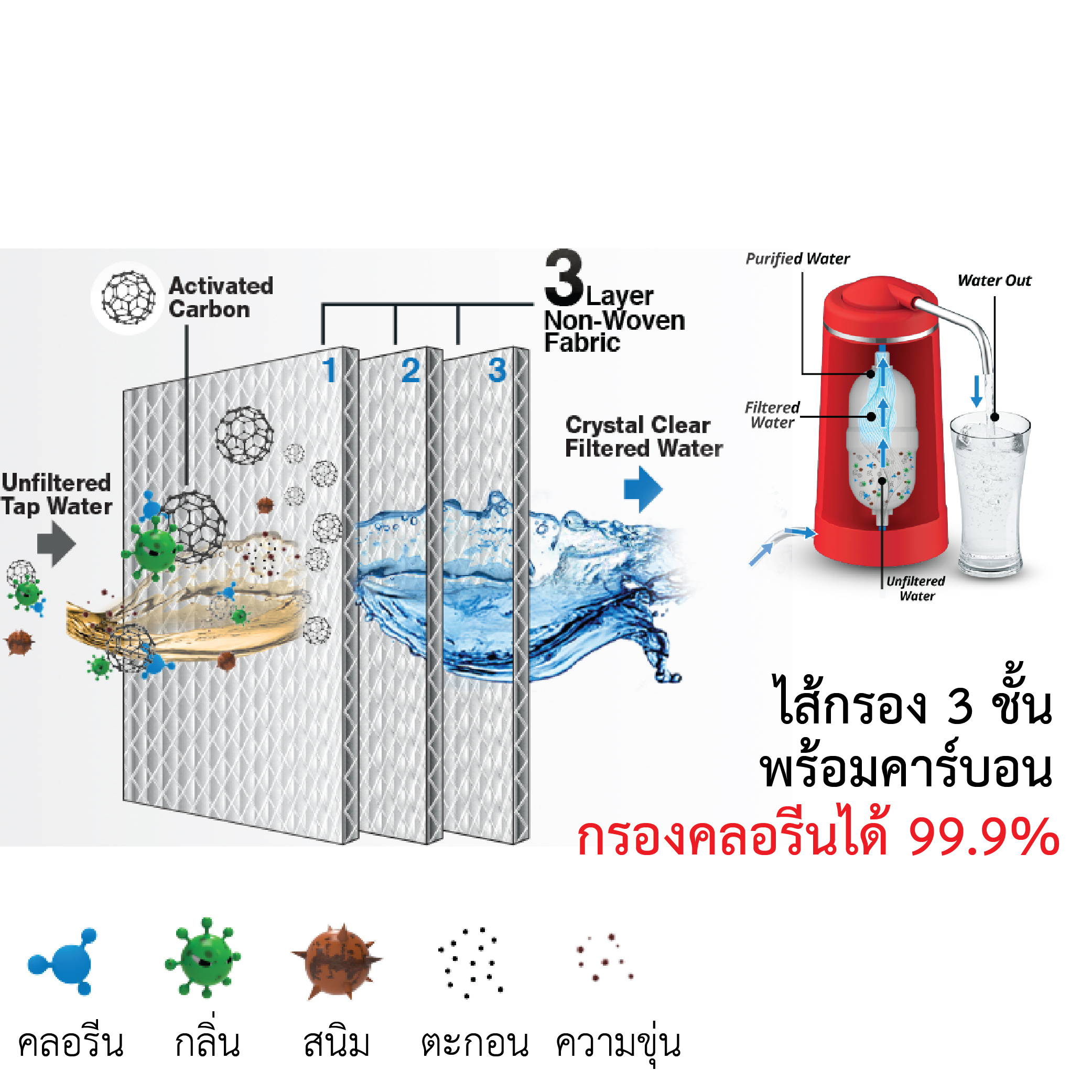 สามารถกรองคลอรีนได้ 99.9% รวมทั้งกรองสนิม, ตะกอน, ความขุ่นและกลิ่นไม่พึงประสงค์ ด้วยไส้กรอง 3 ชั้นที่ผ่านการจดสิทธิบัตร (Non-woven fabric filter)
