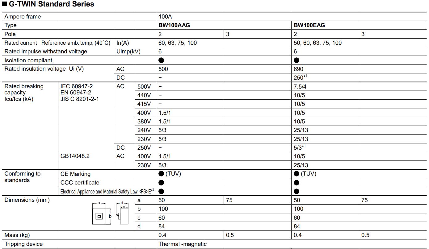 Fuji Molded Case Circuit Breaker รุ่น BW100EAG Poles : 3 Rated Current : 100A Rated Breaking Capacity, Icu (kA) at AC230V : 25kA Rated Breaking Capacity, Icu (kA) at AC400V : 10kA Tripping device : Hydraulic-magnetic มาตรฐานระดับโลก CE, TUV , CCC